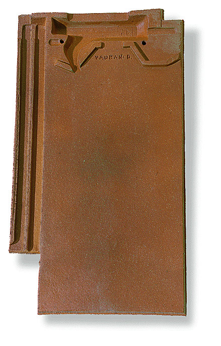 Tuile en terre cuite à pureau plat, double emboîtement latéral et simple emboîtement de tête.